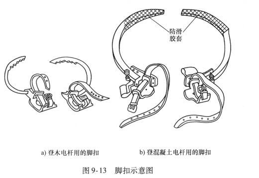 腳扣又稱(chēng)鐵腳,是電工攀登電桿的主要工具。腳扣分兩種:一種扣環(huán)上帶有鐵齒,供登木桿用;另一種在扣環(huán)上裹有橡膠,供登混凝土桿用。腳扣的結(jié)構(gòu)如圖9 - 13所示,用腳扣攀登電桿具有速度快、登桿方法簡(jiǎn)便等特點(diǎn)。